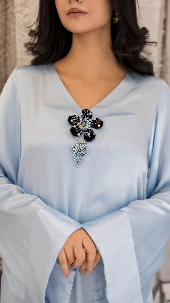 EMBELLISHMENT: Handcrafted floral brooch motif in black and blue tones with crystal, beads, and sequins.
