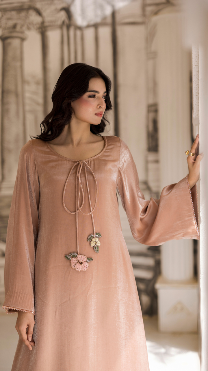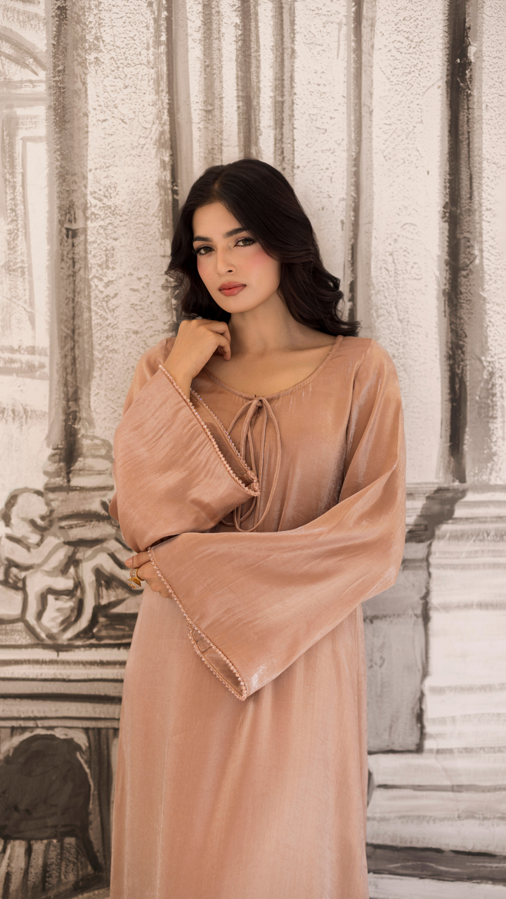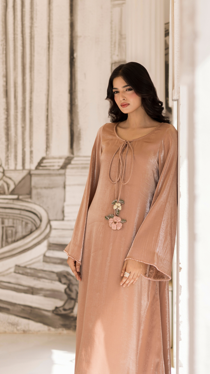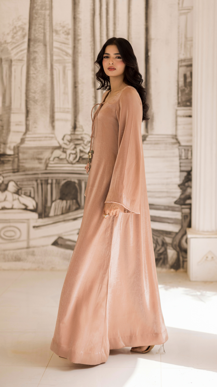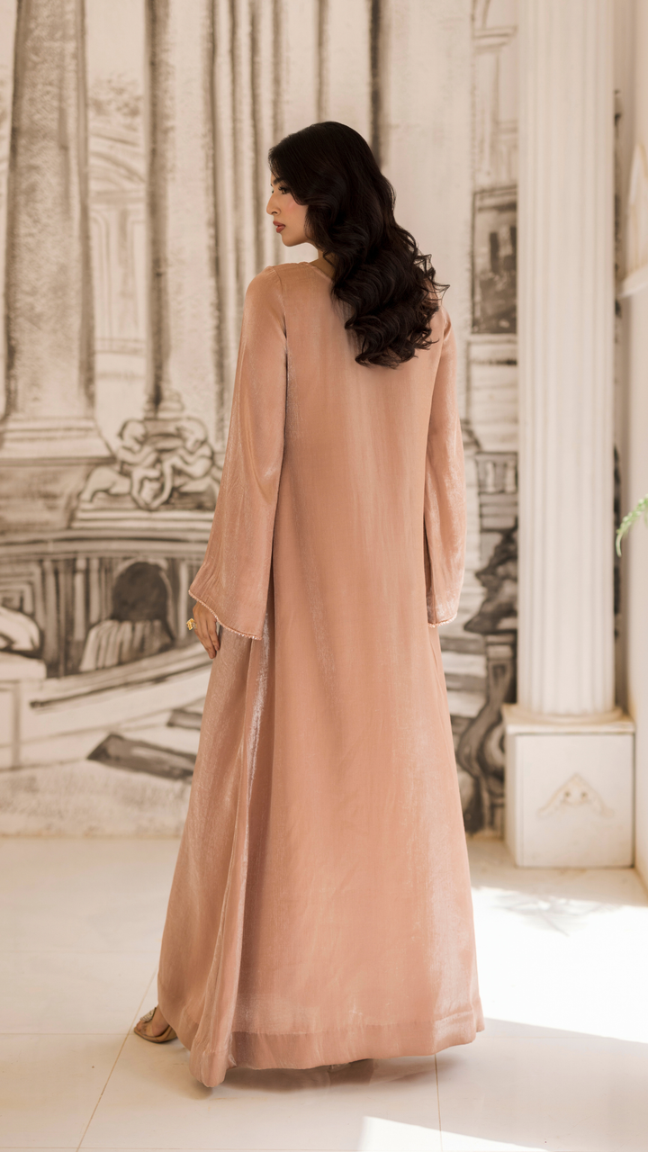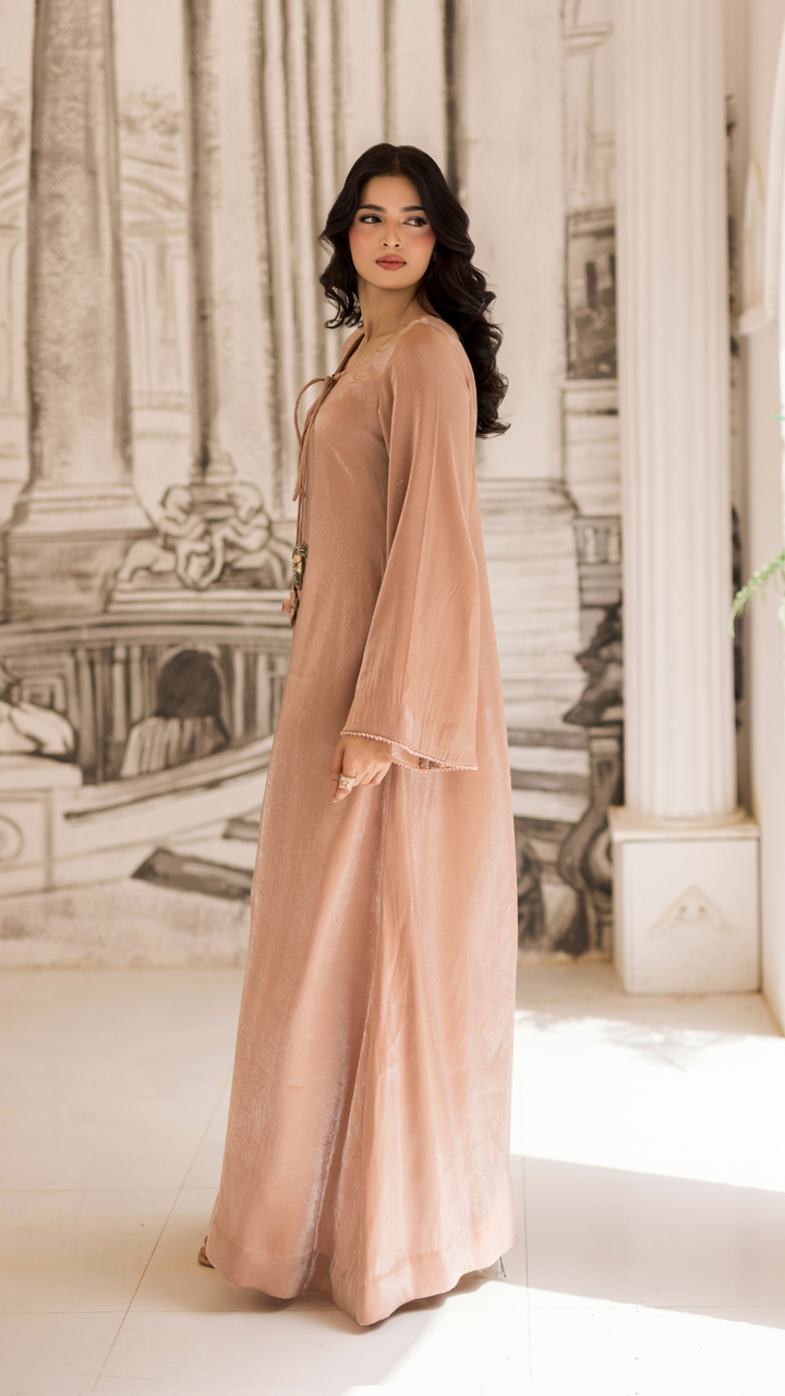 SILHOUETTE: Flowing, floor-length Kaftan with soft flare and draped movement.